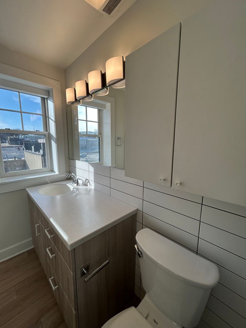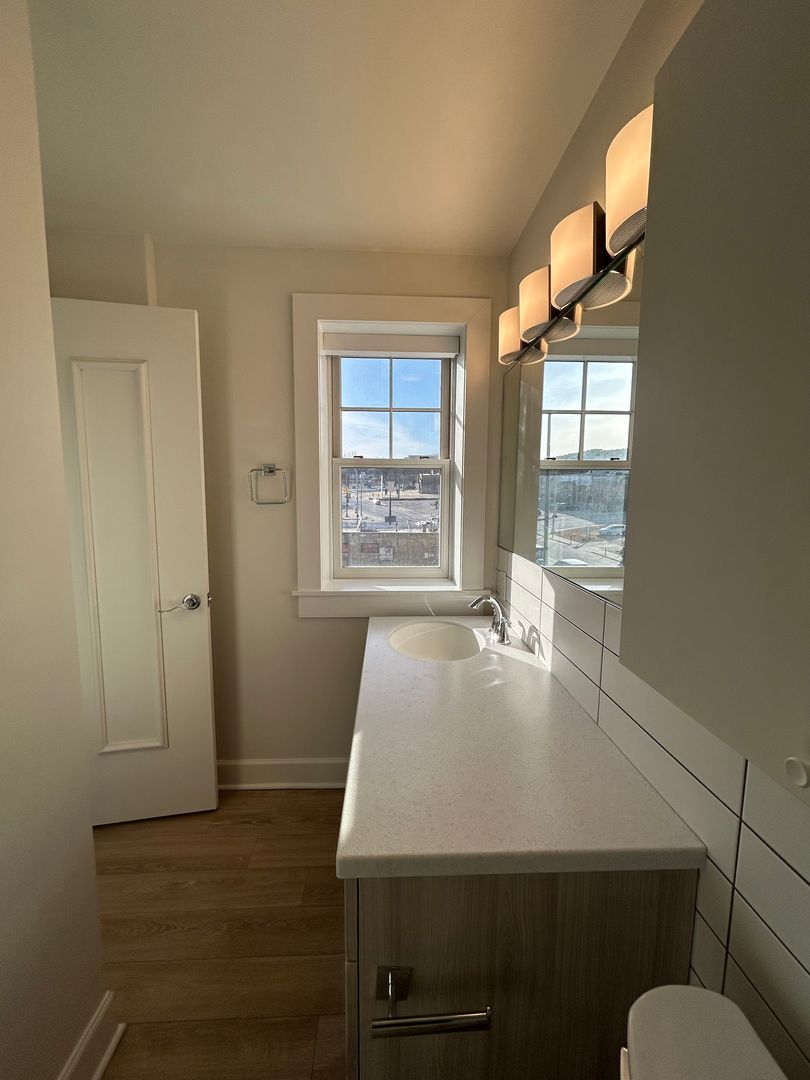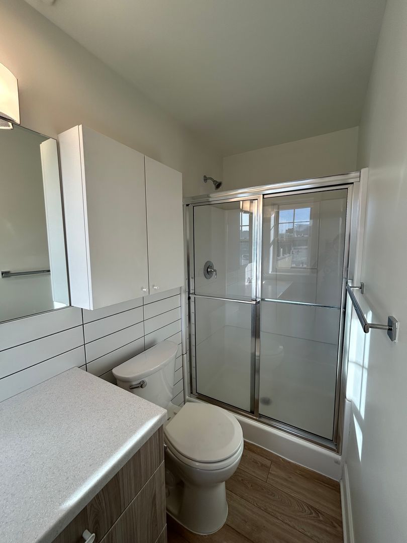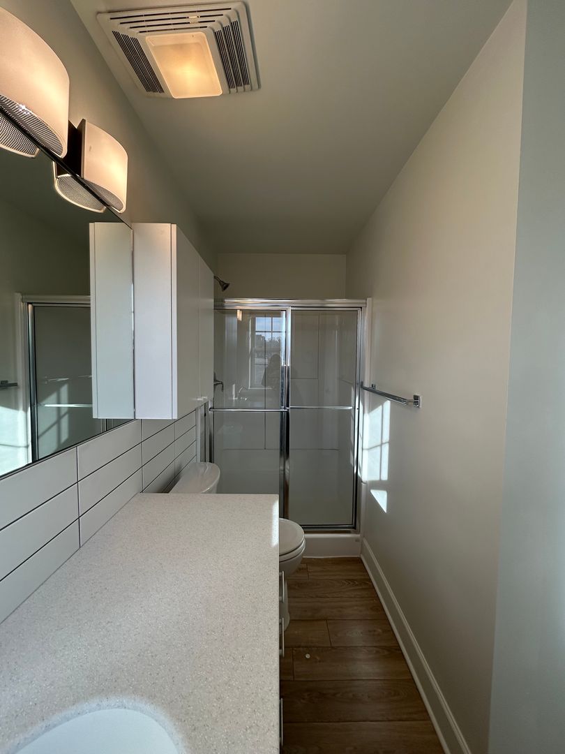 The updated bathroom features a modern vanity with ample storage, bright lighting, and a glass-enclosed shower for a clean, polished look.