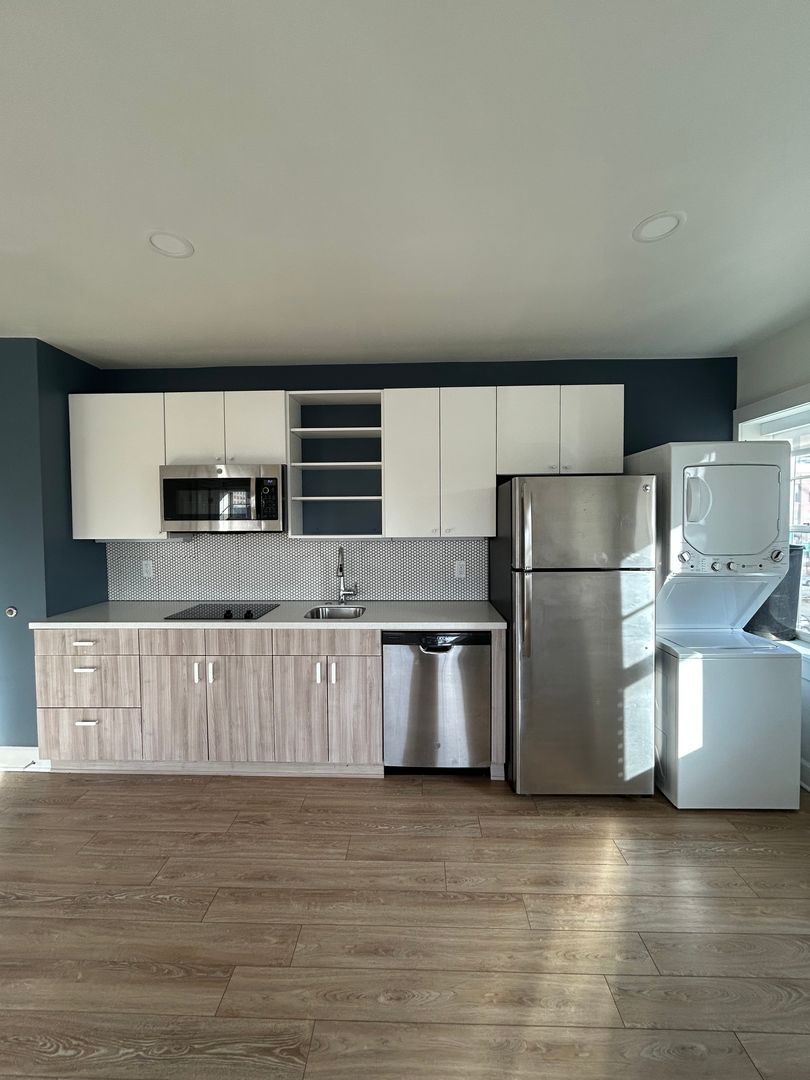 The kitchen offers a sleek, contemporary design with two tone cabinetry, stainless steel appliances, a built in microwave, dishwasher, and modern backsplash. Clean lines and open shelving create both style and practicality. Just steps away, you’ll find the convenience of an in unit washer and dryer neatly tucked beside the kitchen.
