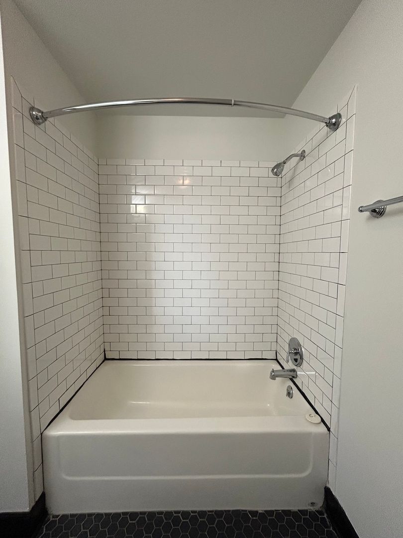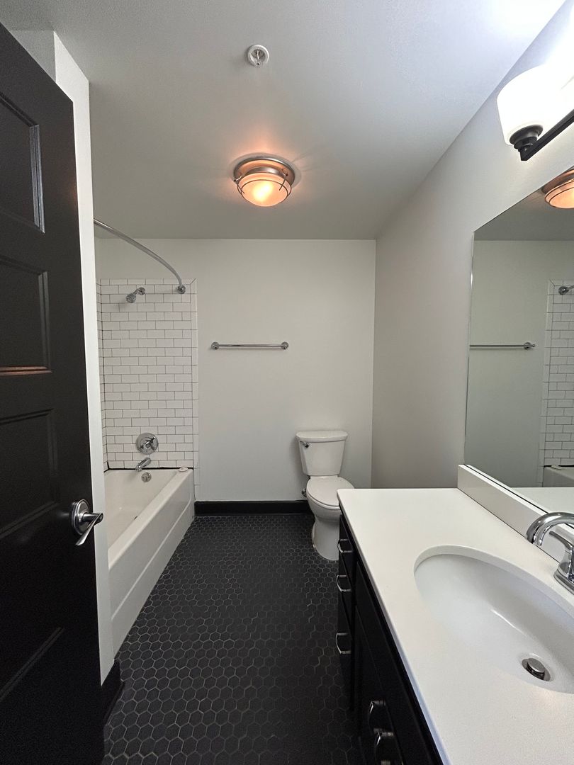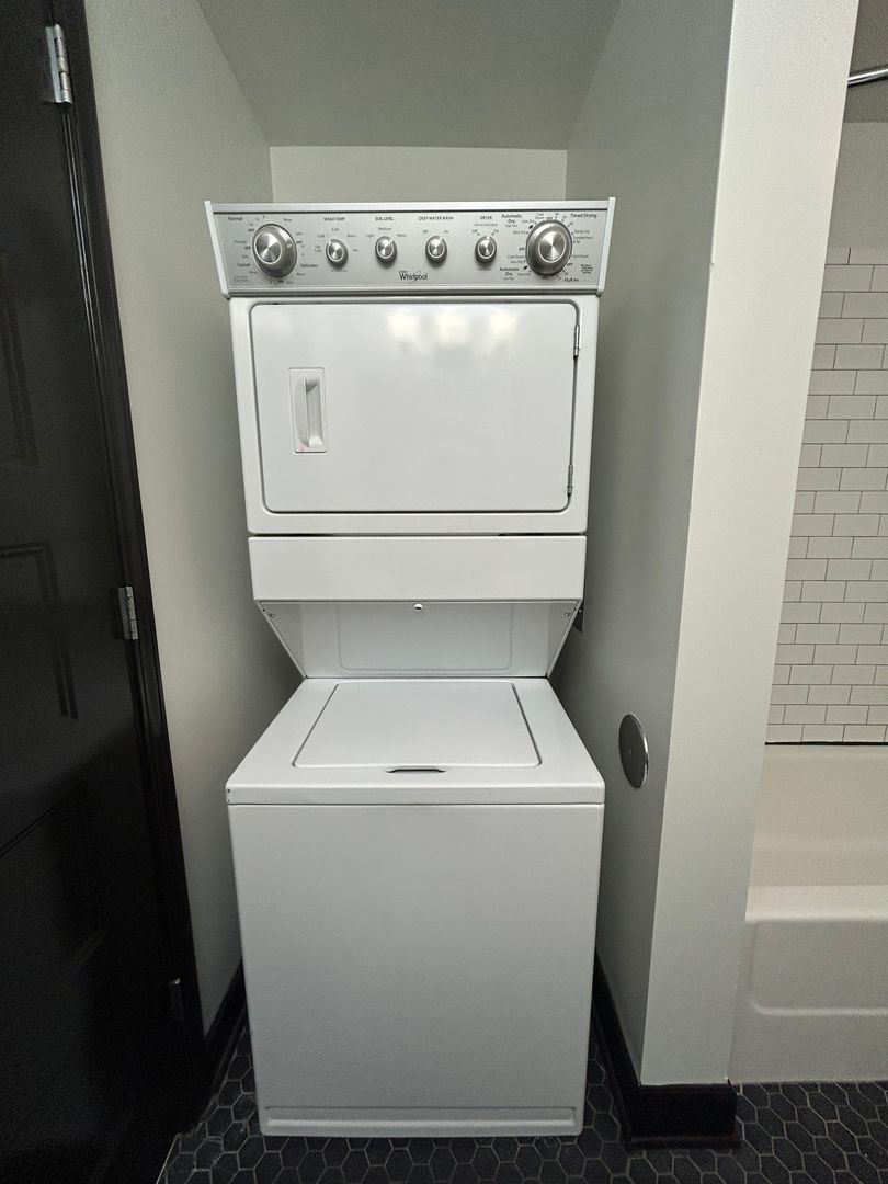 The bathroom continues the modern aesthetic with bold hex tile flooring, a large vanity with plenty of counter space, and a clean, tiled shower surround. You’ll also love the convenience of in unit stacked washer and dryer making everyday living that much easier.