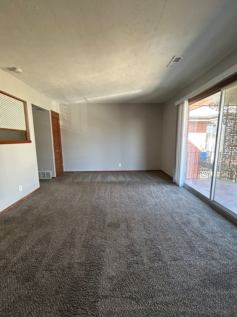 The spacious living room features plush carpeting and large sliding glass doors that lead directly to your private balcony. The decorative wrought iron railing adds timeless charm while giving you the perfect outdoor space to enjoy fresh air and neighborhood views. Natural light fills the space, creating a warm and welcoming atmosphere.