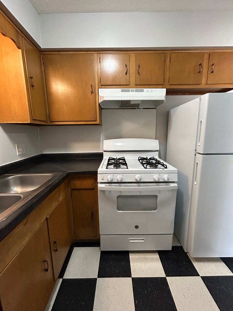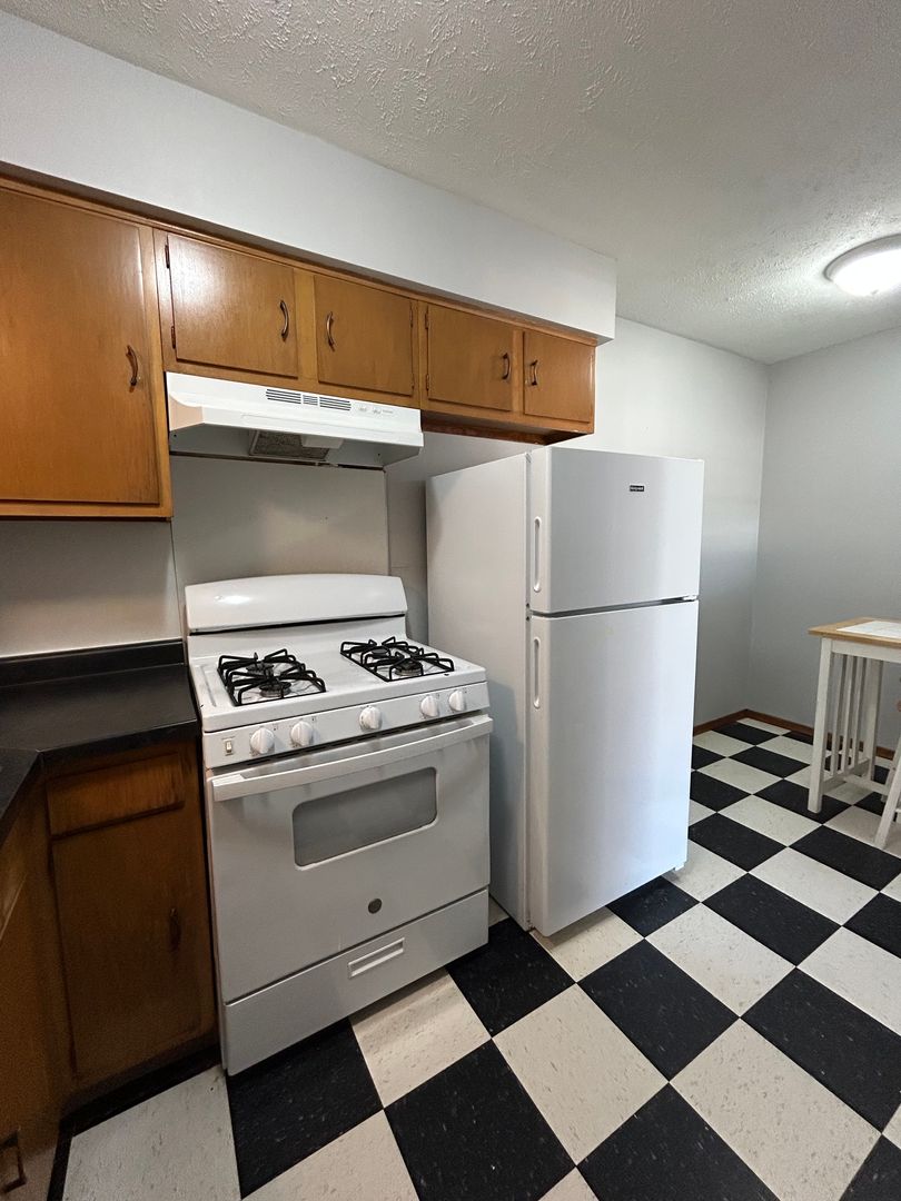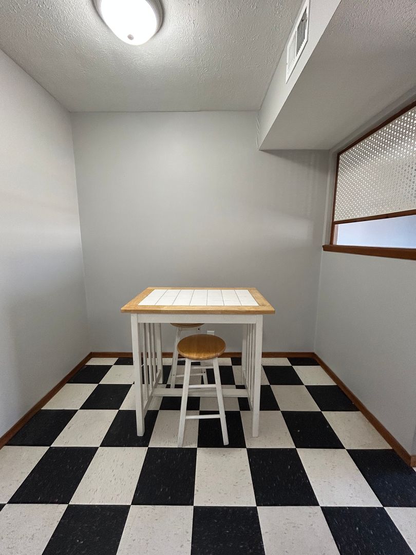 Just off the living area, the kitchen showcases retro black and white checkered flooring paired with rich wood cabinetry and ample counter space. The layout offers a cozy dining nook ideal for morning coffee or casual meals, and the full-size appliances make everyday living easy and convenient.