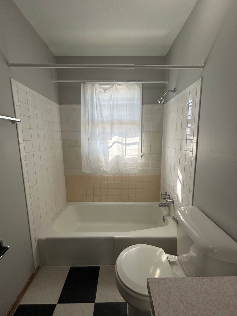 The bedroom is generously sized with great closet space and large windows that bring in beautiful natural light. The bathroom continues the vintage appeal with classic tile work, a full tub and shower combination, and a spacious vanity for storage and functionality.