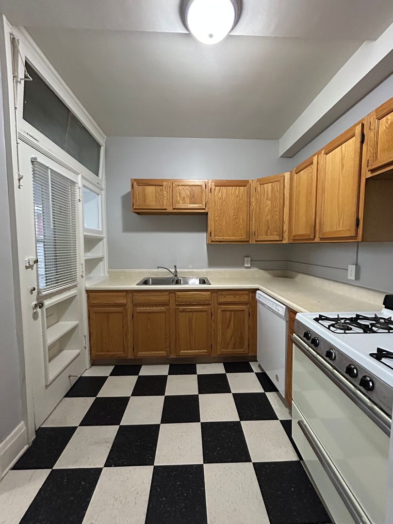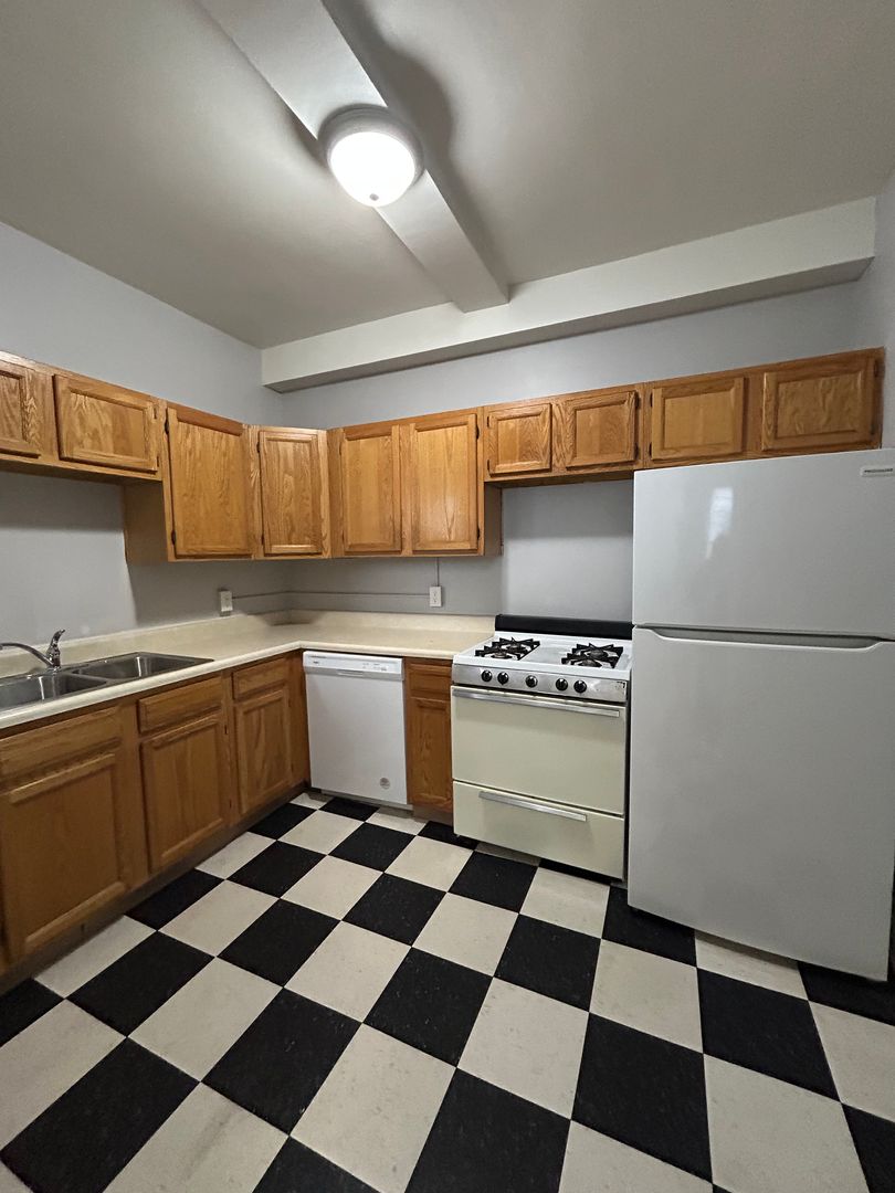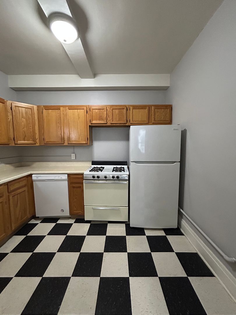 -Functional kitchen with ample cabinet space, gas stove, refrigerator, and dishwasher