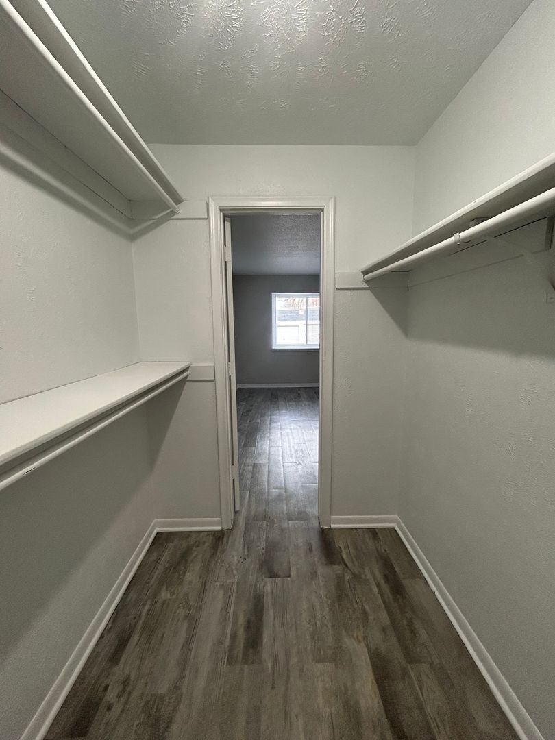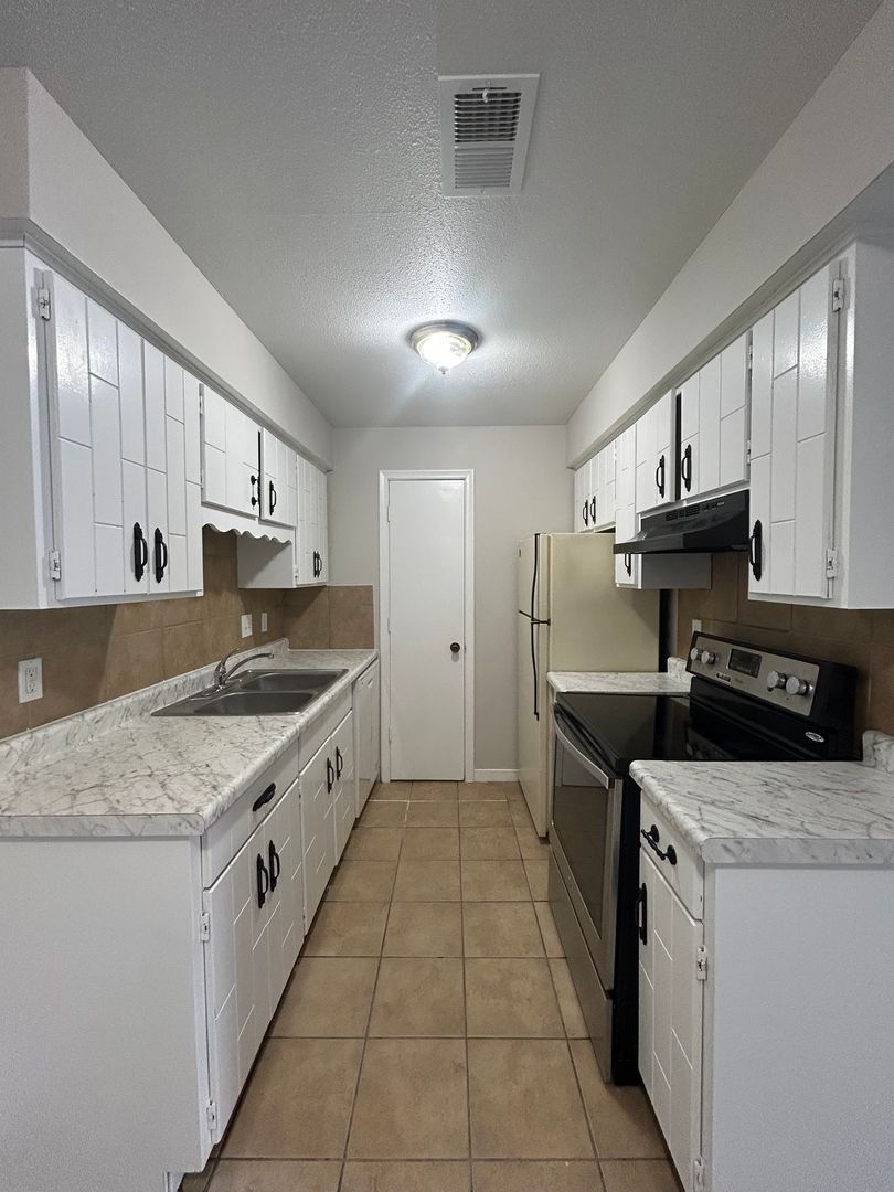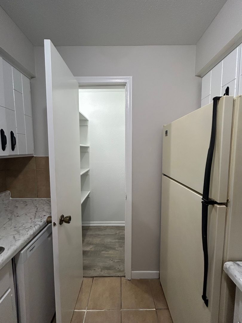 The kitchen features crisp white cabinetry, updated countertops, ample storage space, and a convenient pantry. Both bedrooms are generously sized with great closet space, and the large walk in closet offers even more room for storage and organization.