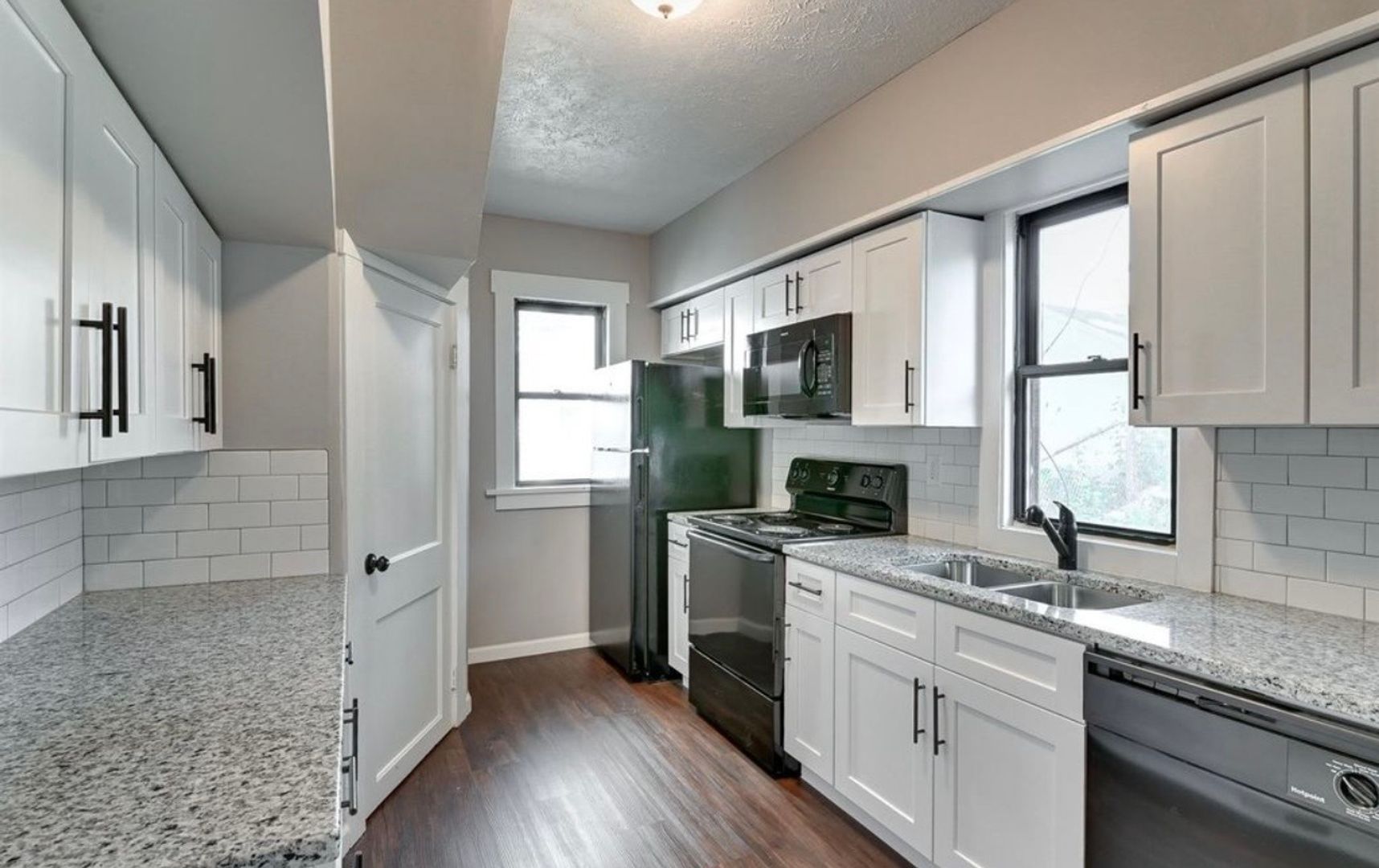 The updated kitchen features modern white cabinetry, granite countertops, subway tile backsplash, and stainless steel appliances, providing a clean and stylish space for cooking and entertaining. The efficient layout offers generous cabinet storage and countertop space while still maintaining a bright and open feel.