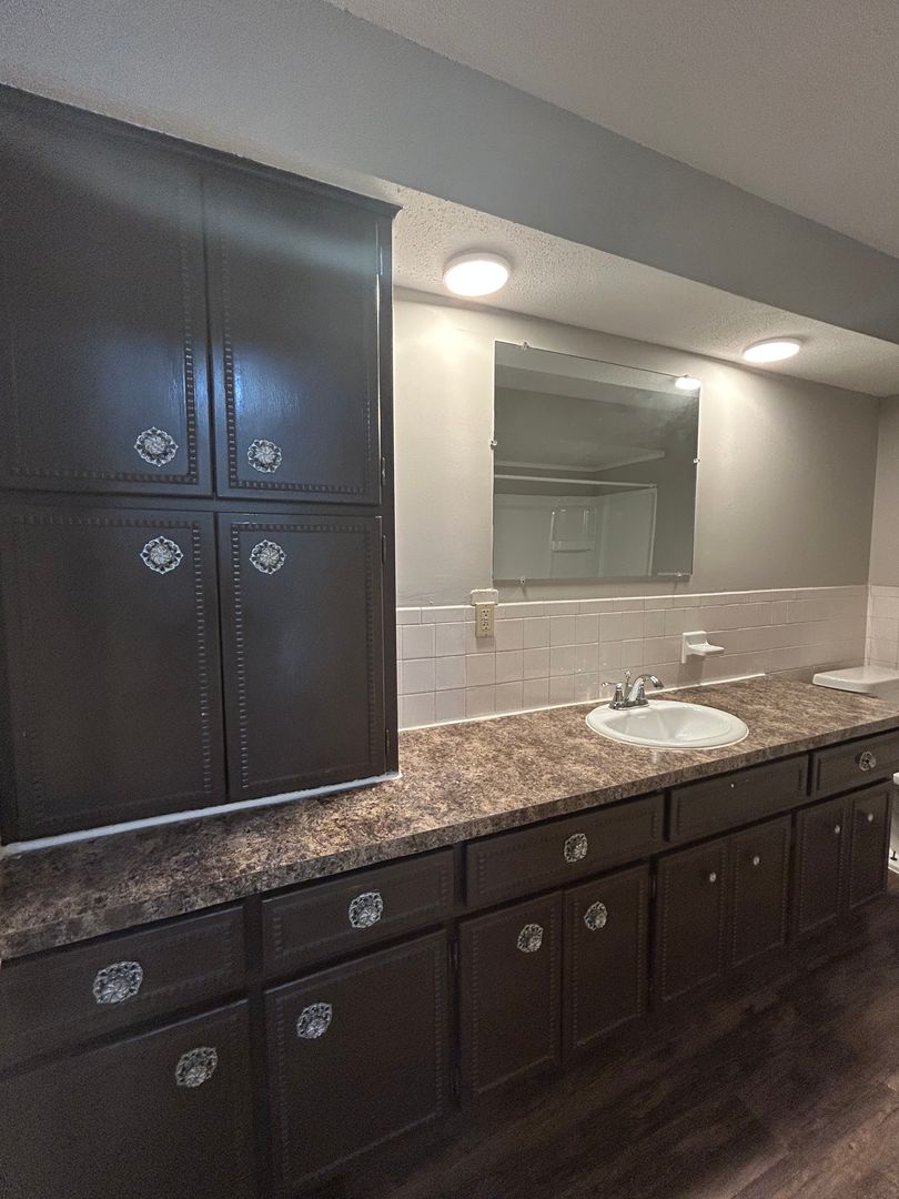 -Oversized bathroom featuring a large vanity, ample counter space, and a tub/shower combo