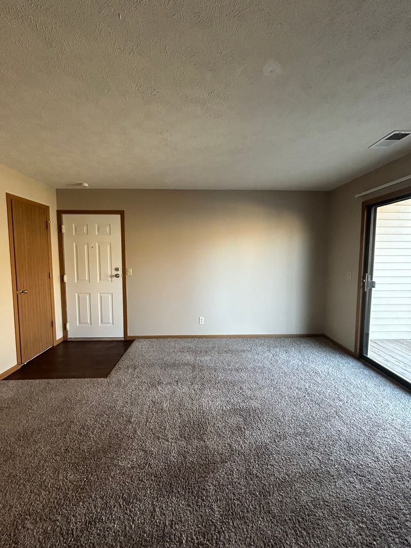 As you step inside, you’re welcomed by a large open living room featuring plush carpeting and sliding glass doors that lead to your own private balcony the perfect spot to enjoy fresh air and unwind. The space easily accommodates both living and dining furniture, making it ideal for relaxing or entertaining.