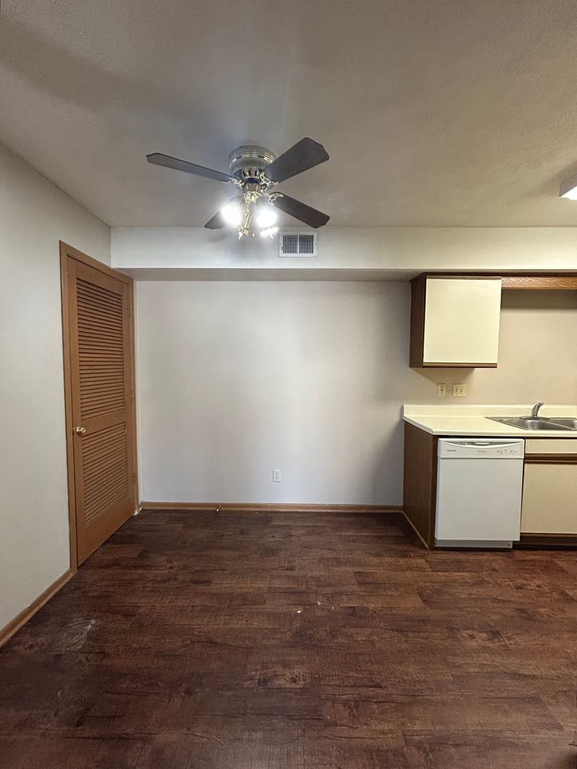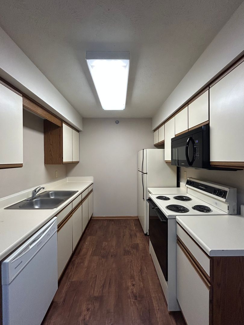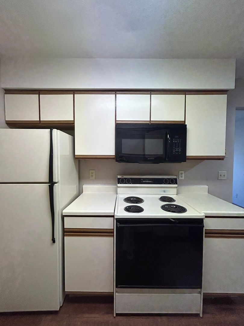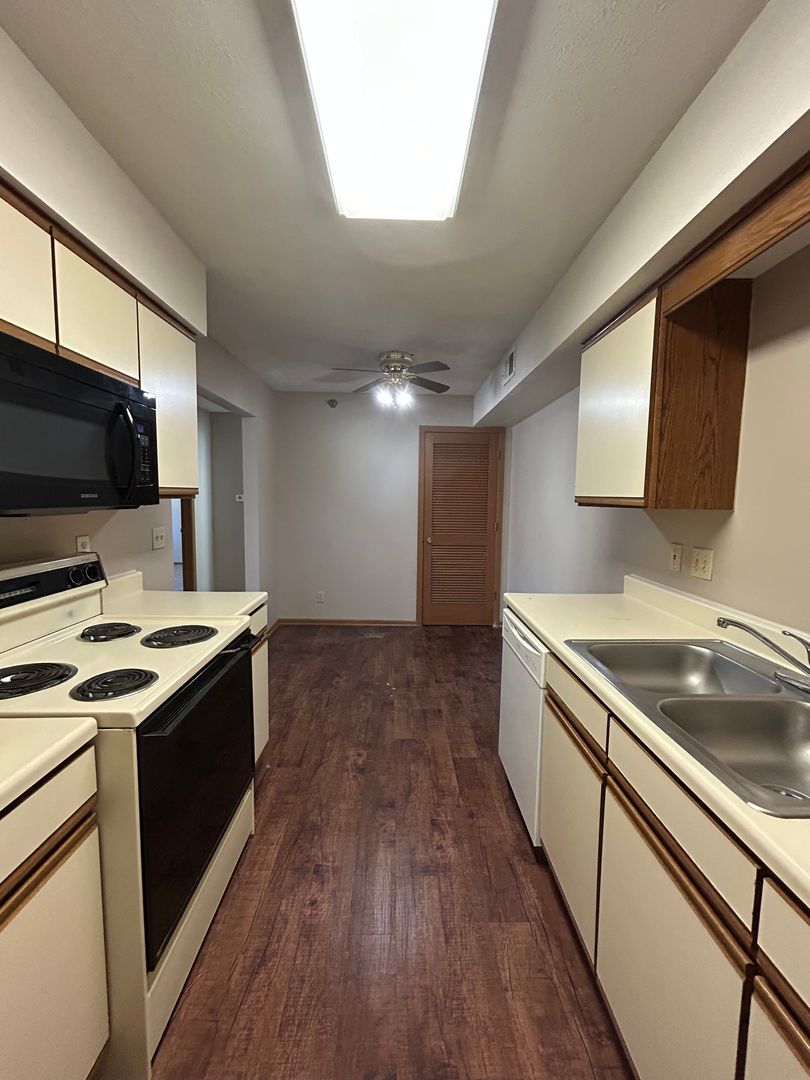 The kitchen offers a classic galley style layout with ample cabinet and countertop space, a dishwasher, full size stove and refrigerator, and clean, easy to maintain flooring. It’s designed to make everyday cooking simple and efficient.