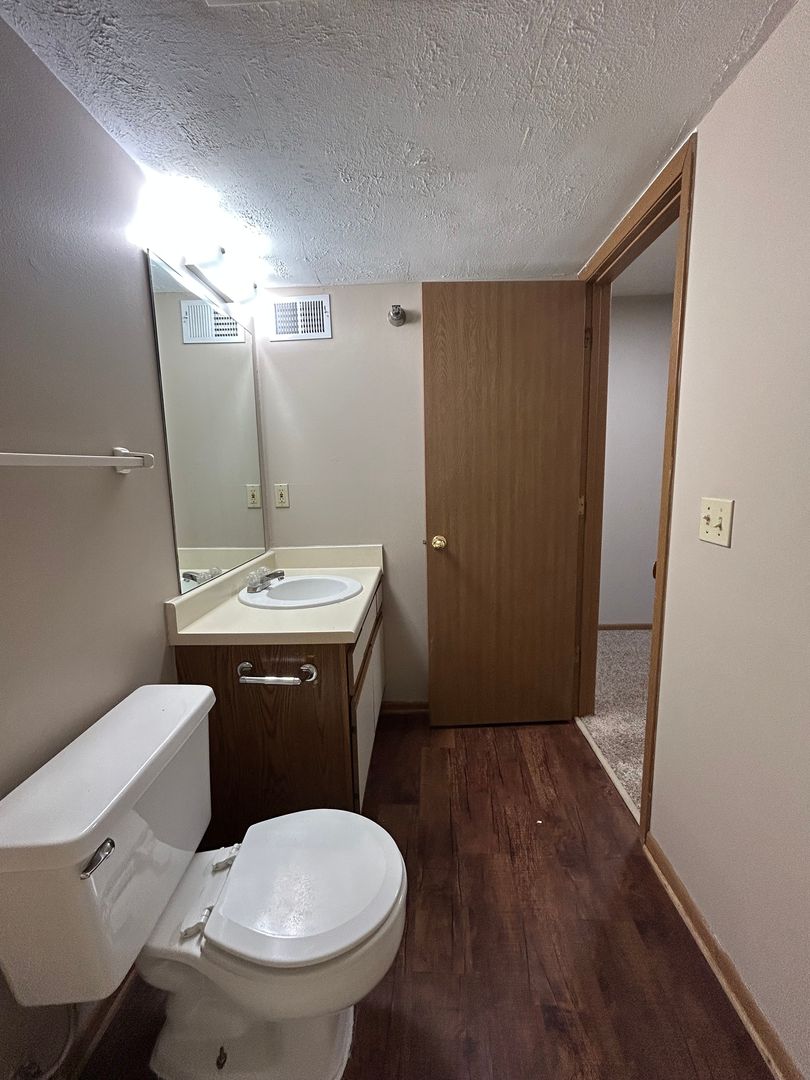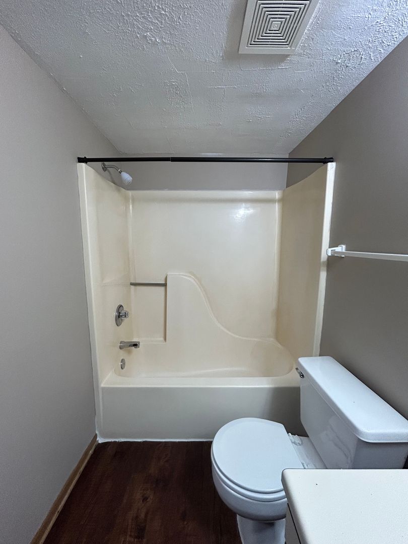 The bathroom features a full tub and shower, large vanity with storage, and updated flooring for a clean, modern feel.