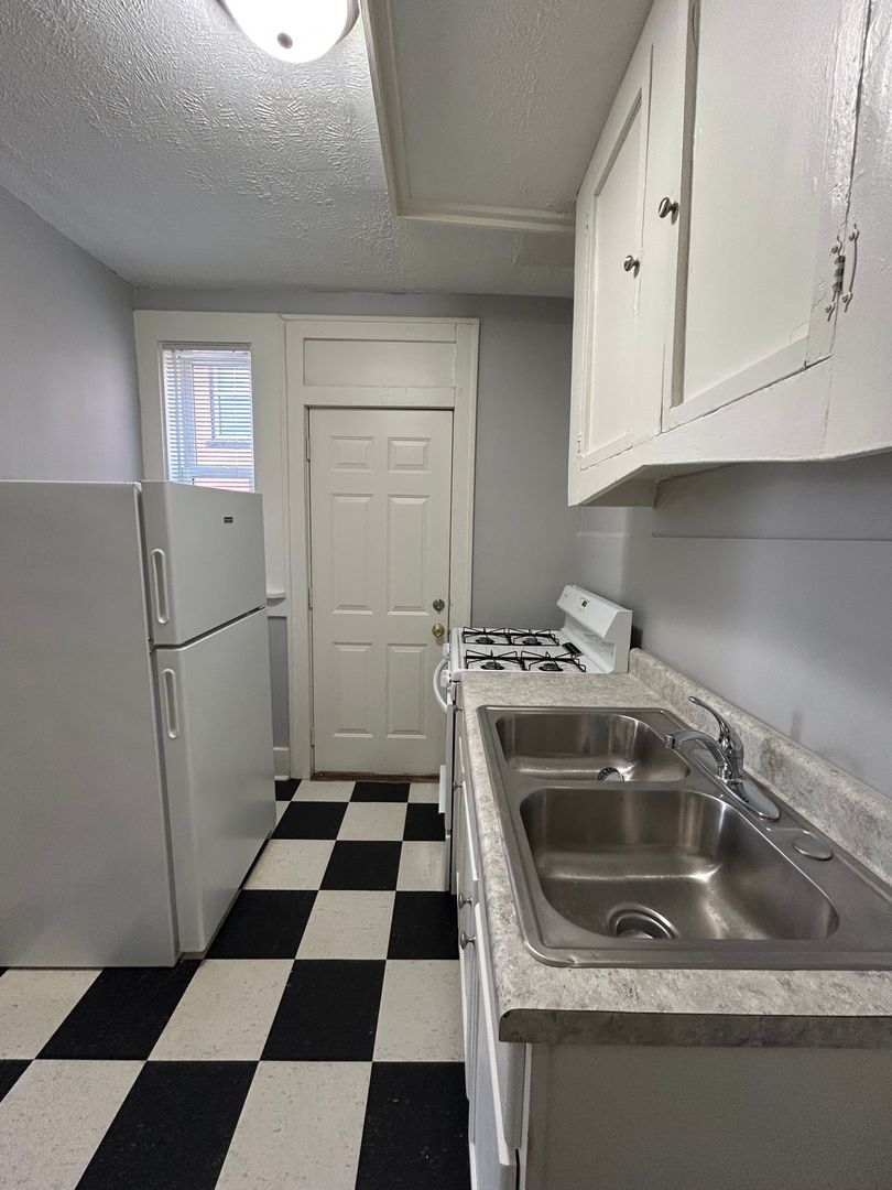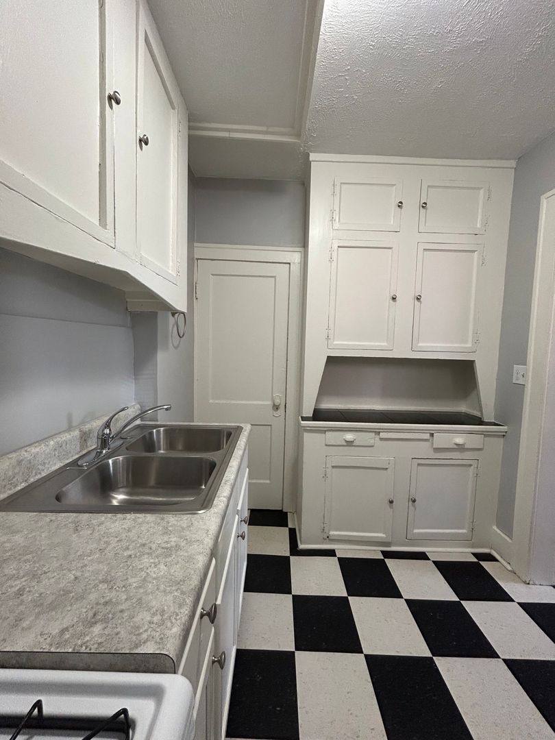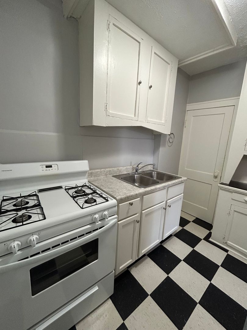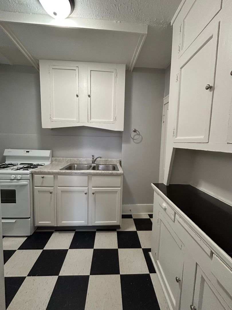 The kitchen features classic cabinetry with plenty of storage, a gas stove, full size refrigerator, and generous counter space, making meal preparation easy and efficient. The charming black-and-white tile flooring adds a timeless touch to the space while built-in cabinets provide additional storage.