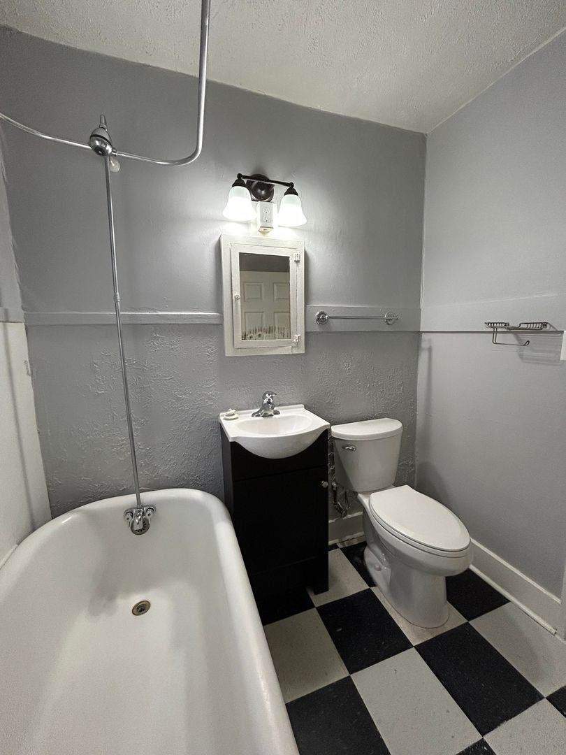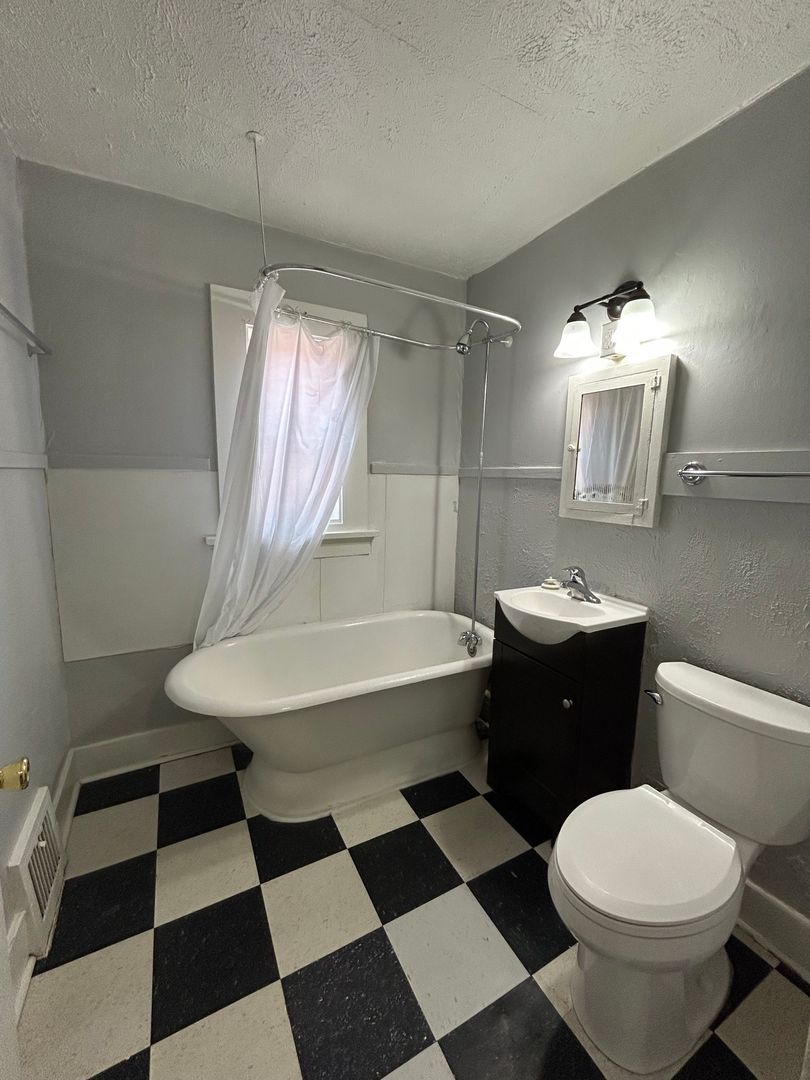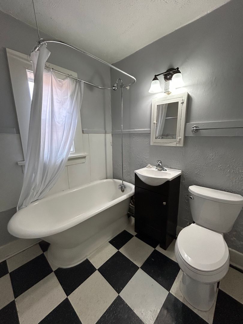 The bathroom features a classic clawfoot bathtub and shower combination, giving the home a unique vintage feel while still providing everyday functionality.