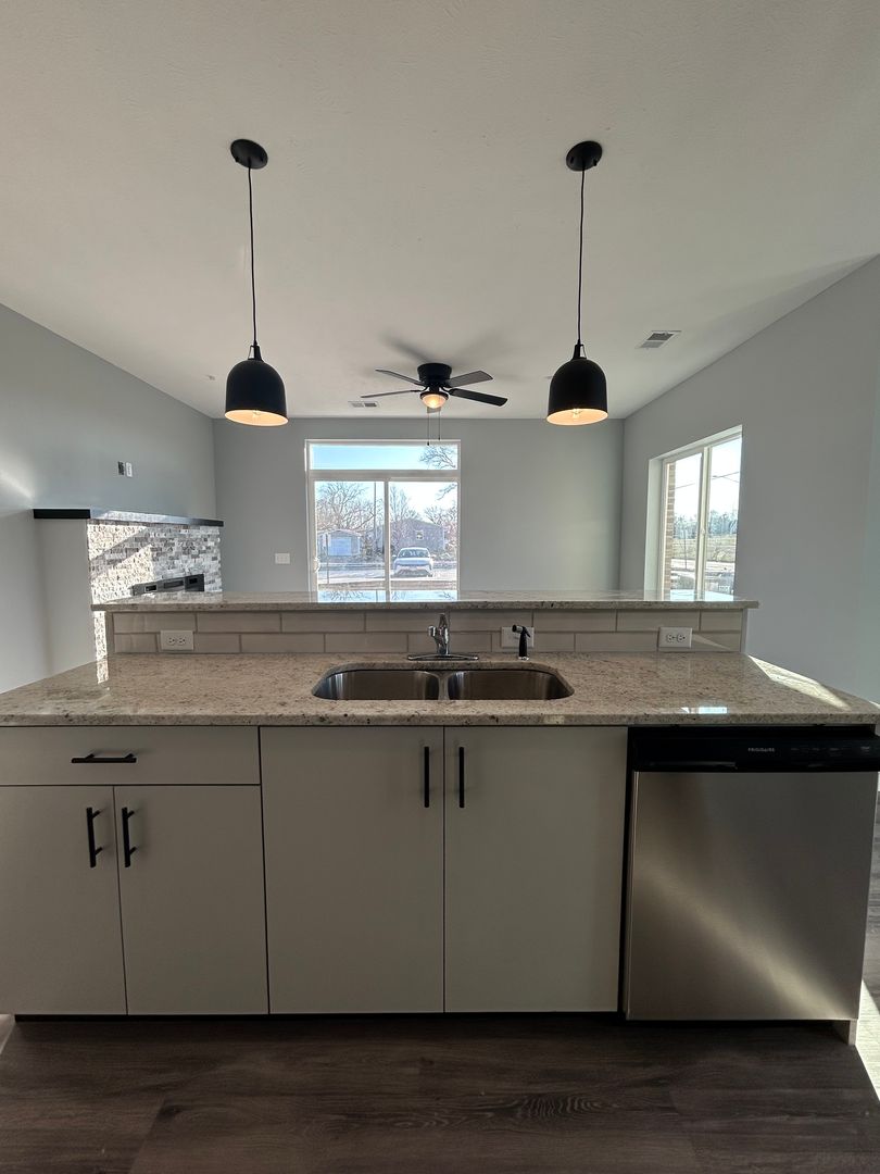 The kitchen is designed with both functionality and style in mind, featuring sleek cabinetry, beautiful countertops, stainless steel appliances, and a spacious center island with sink and dishwasher. Pendant lighting above the island adds a modern touch while providing the perfect space for casual dining, meal prep, or entertaining guests.