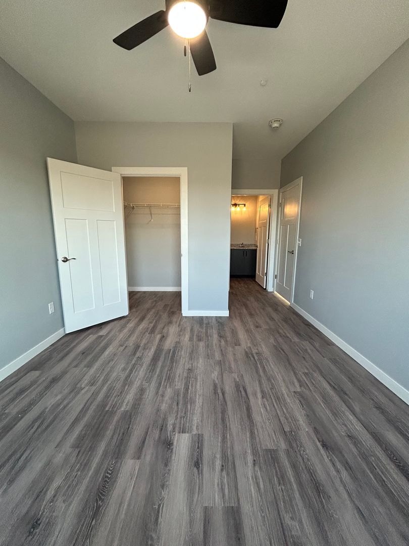Both bedrooms are generously sized and feature large windows, modern ceiling fans, and walk in closets that provide excellent storage space. The primary bedroom includes a private bathroom with a modern vanity and sleek finishes, creating a comfortable and private retreat within the apartment.