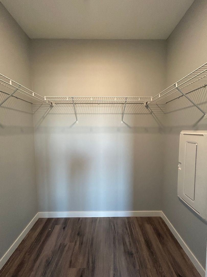 As you enter the apartment, you are welcomed by a bright and open living space featuring large windows that flood the room with natural light, beautiful luxury vinyl plank flooring, and a stunning modern fireplace that creates the perfect focal point for the living area. The open concept design provides plenty of room for both relaxing and entertaining while maintaining a clean, contemporary feel.