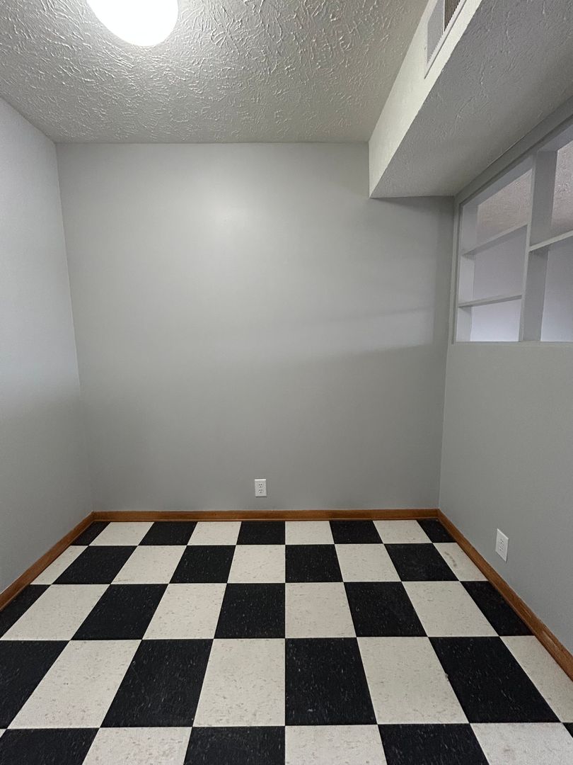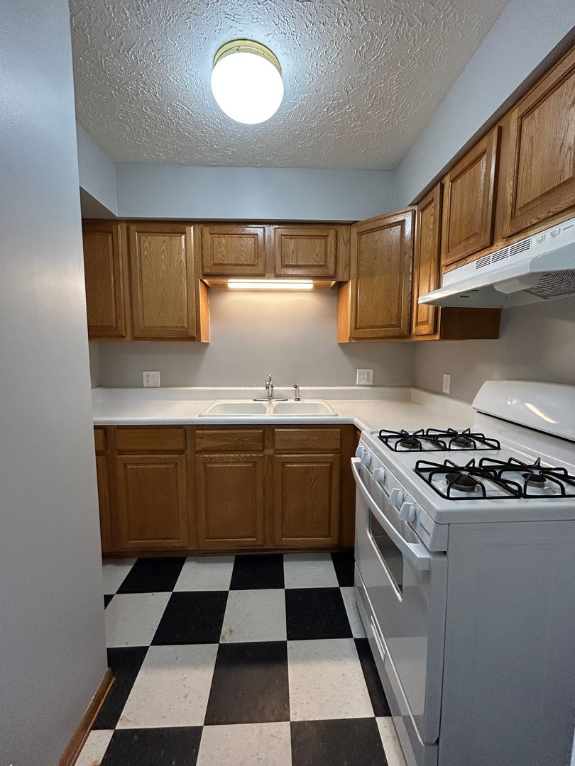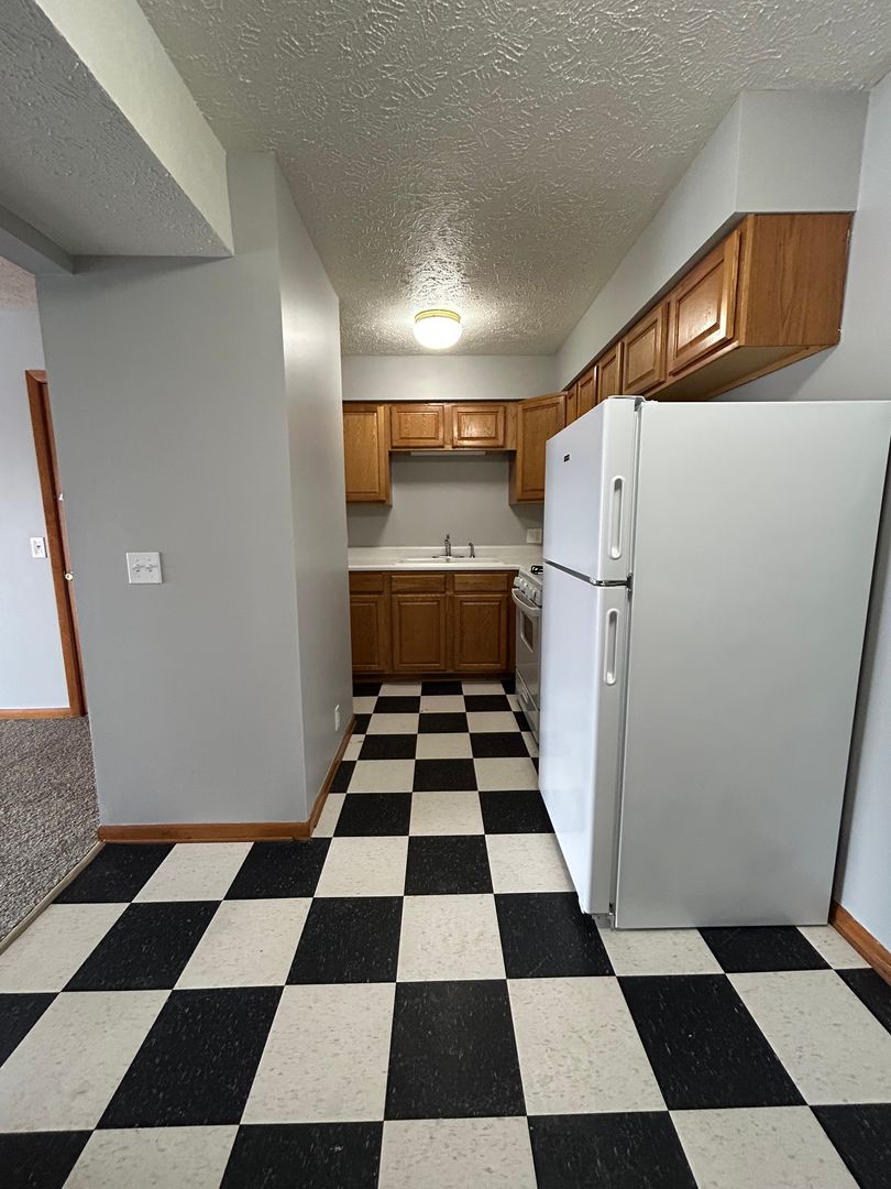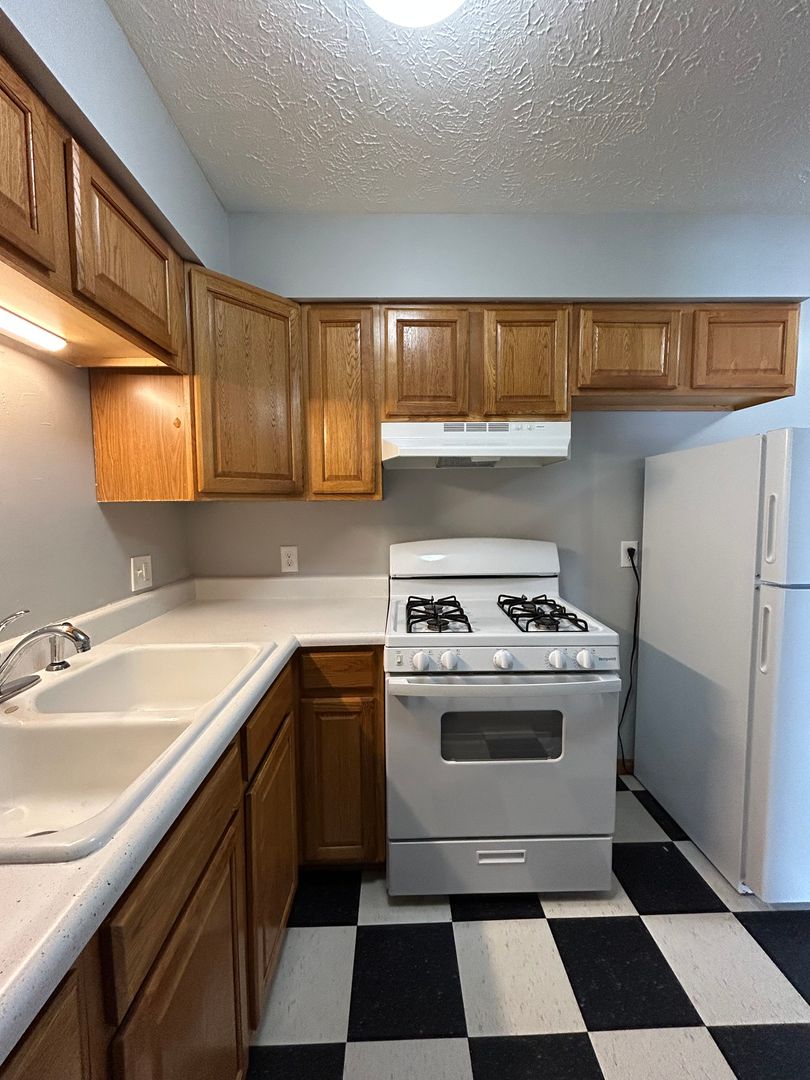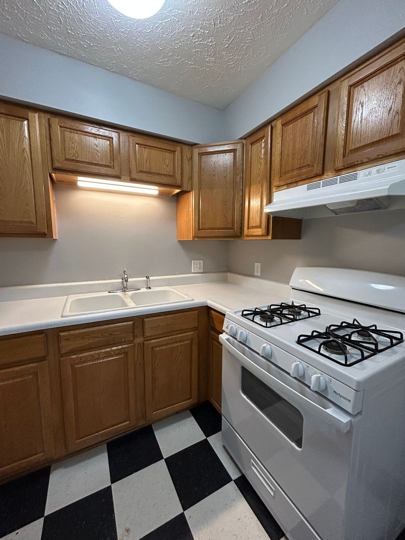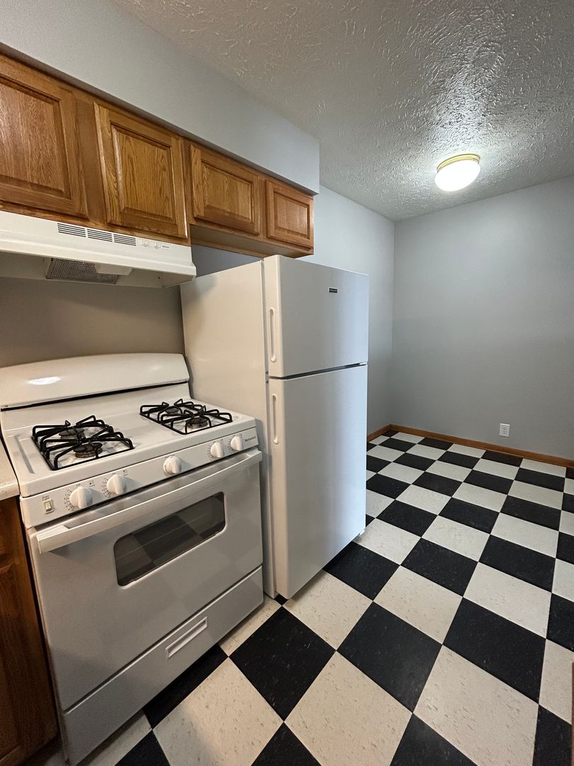 The kitchen features classic cabinetry, ample counter space, and full size appliances, along with a dedicated dining area that provides plenty of room for meals or a flexible workspace. The black and white flooring adds a touch of character and charm to the space.