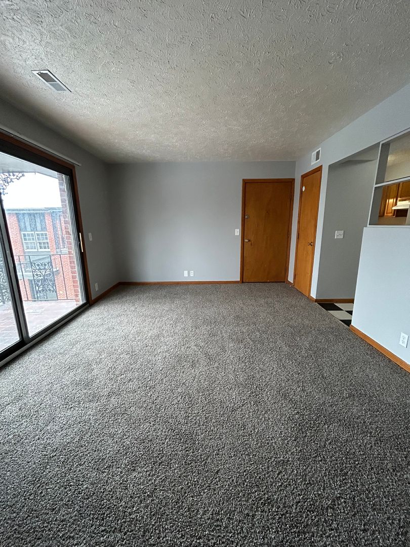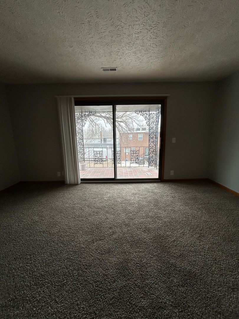 Step into the large living room featuring plush carpeting and oversized sliding glass doors that lead out to your private balcony, creating a bright and open space perfect for relaxing or entertaining. The balcony offers a charming outdoor area with unique detailing ideal for enjoying your morning coffee or unwinding in the evening.