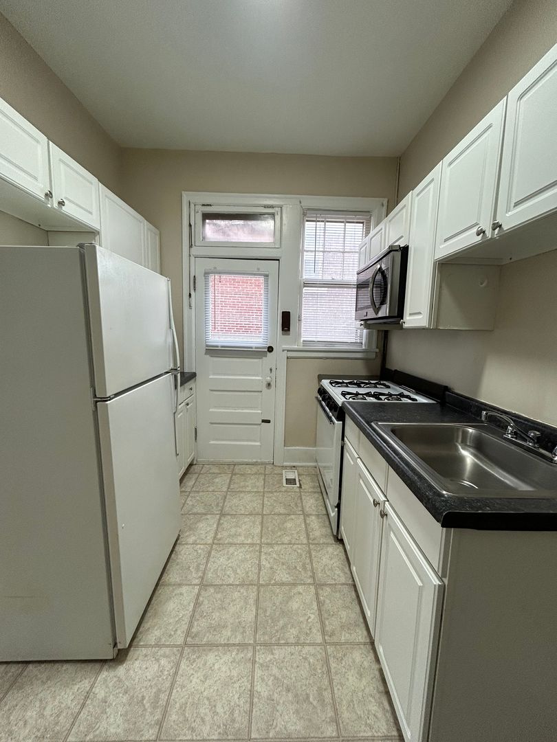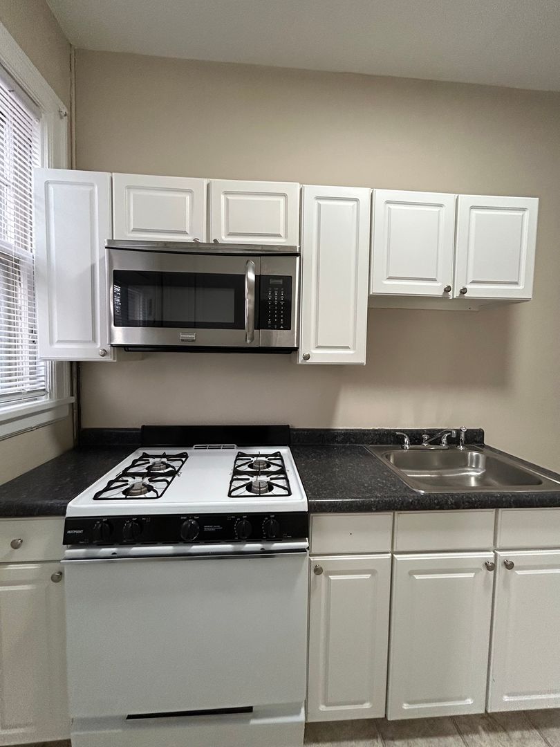 -Bright kitchen featuring ample cabinet space, gas stove, and built in microwave