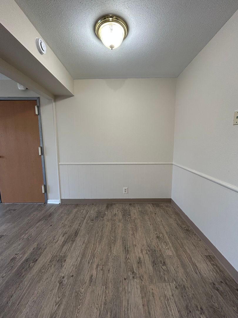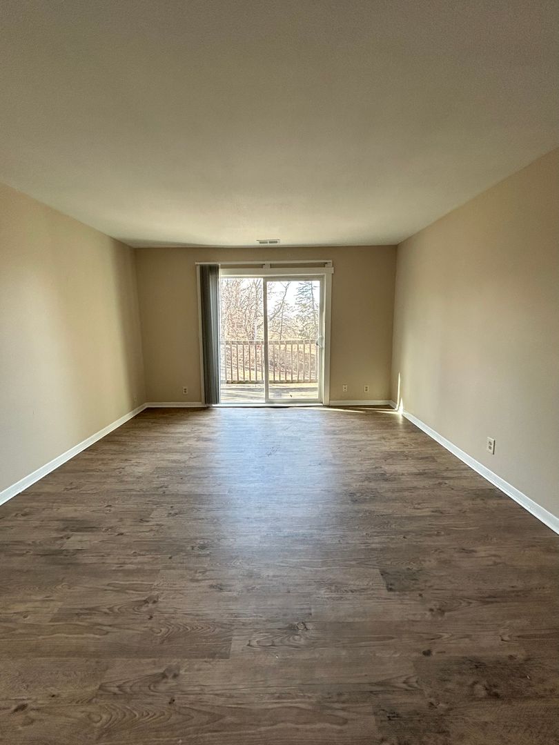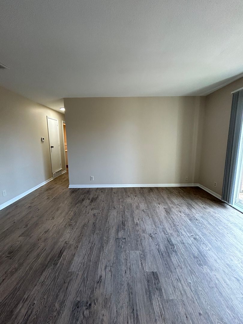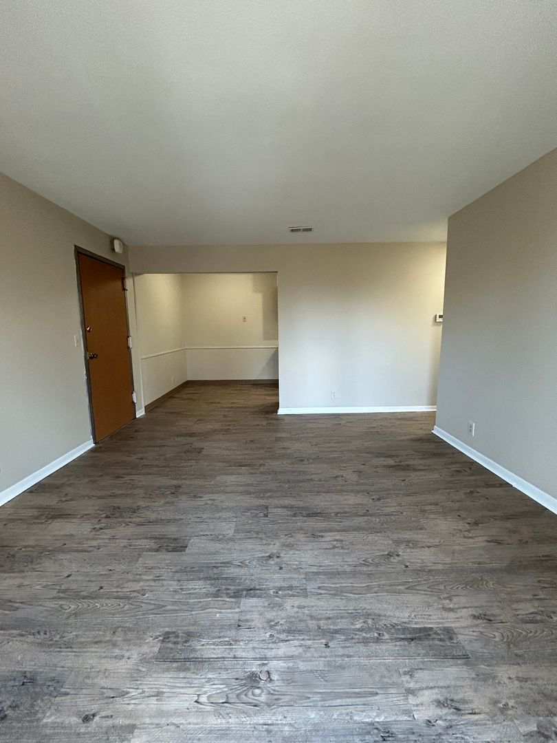Step into the expansive living room featuring updated wood style flooring and large sliding glass doors that lead out to a private balcony, filling the space with natural light and creating the perfect spot to unwind or entertain. The open layout flows seamlessly into a dedicated dining area, giving you plenty of room for hosting or everyday living.