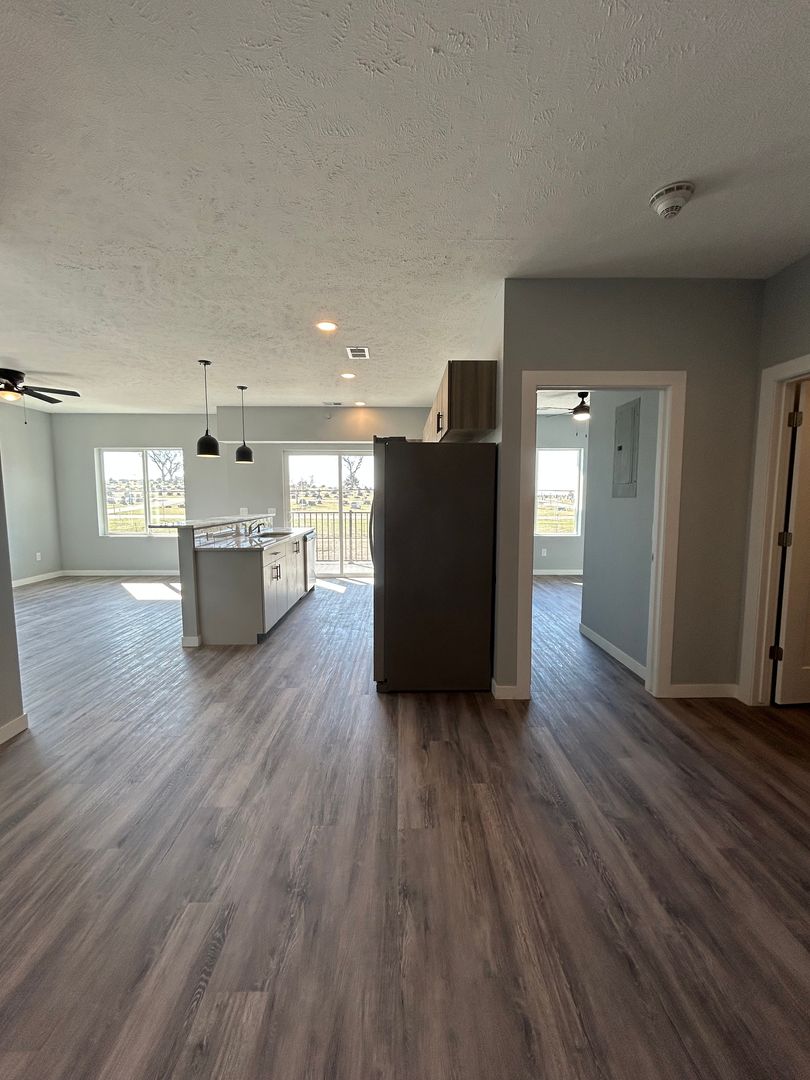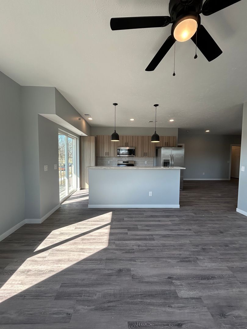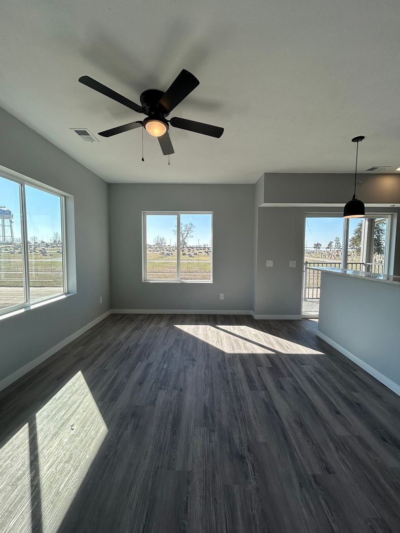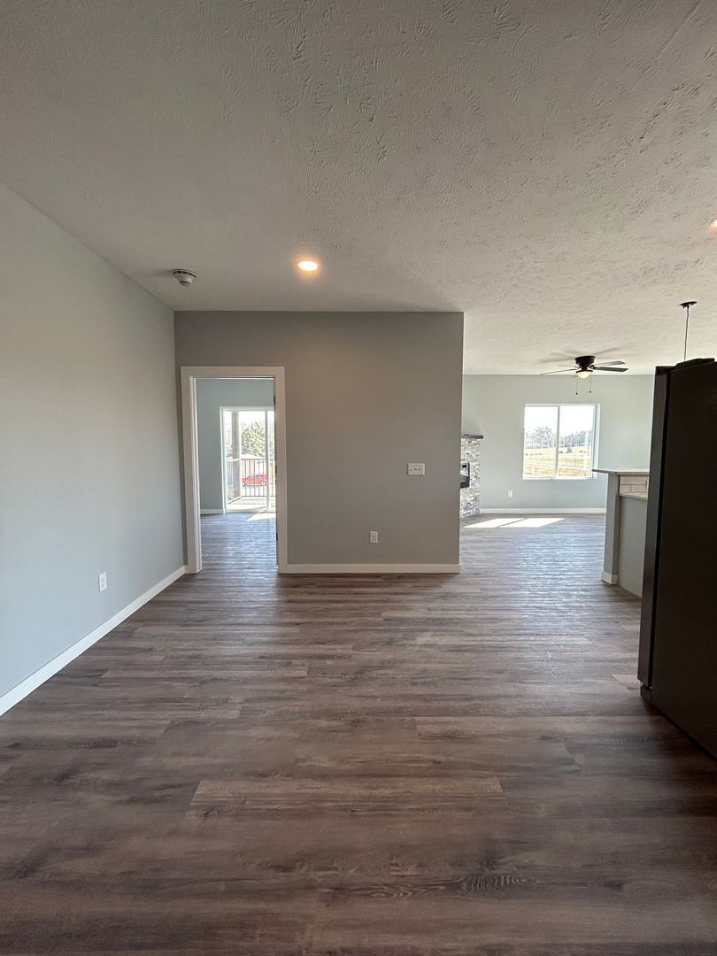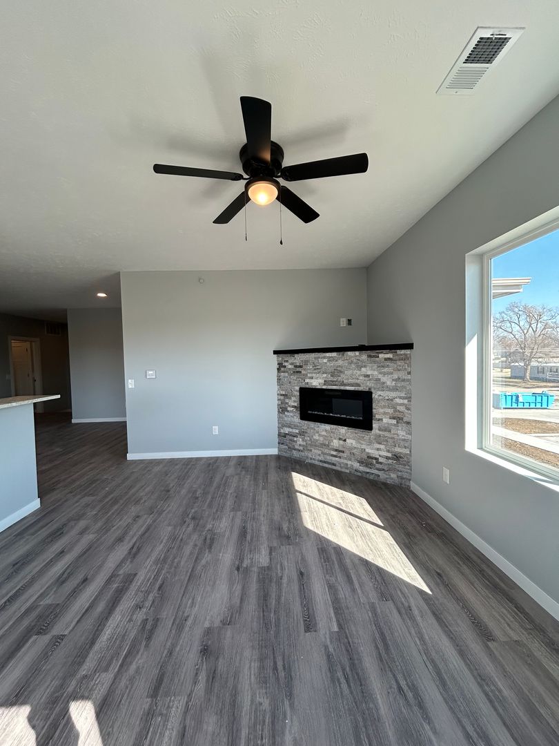 As you step inside, you’re greeted by a large open living room with beautiful luxury vinyl plank flooring, modern gray tones, and large windows that bring in plenty of natural light. A stylish electric fireplace feature wall adds a cozy and modern focal point to the space while the ceiling fan provides comfort year round. The open layout flows seamlessly into the kitchen and dining area, making the entire space feel connected and inviting.