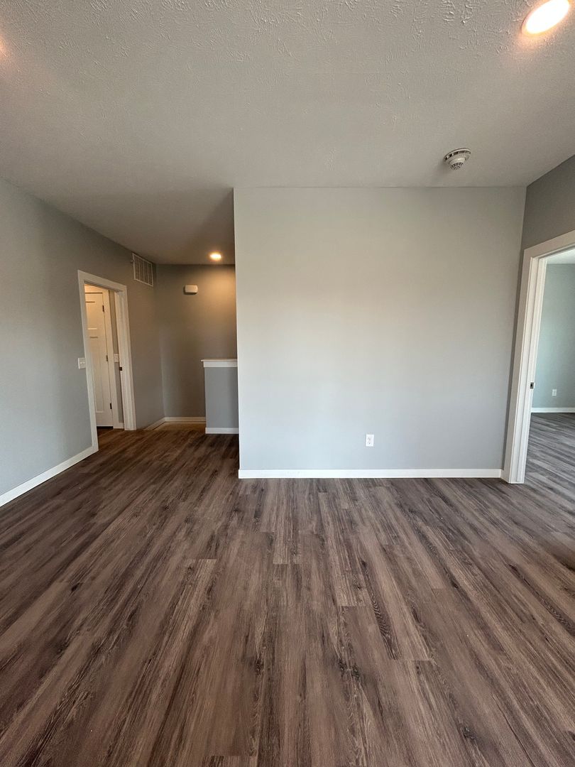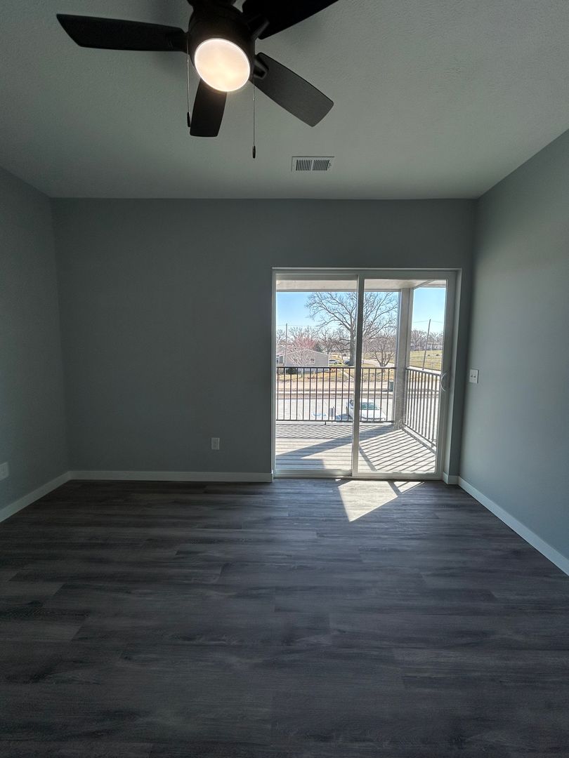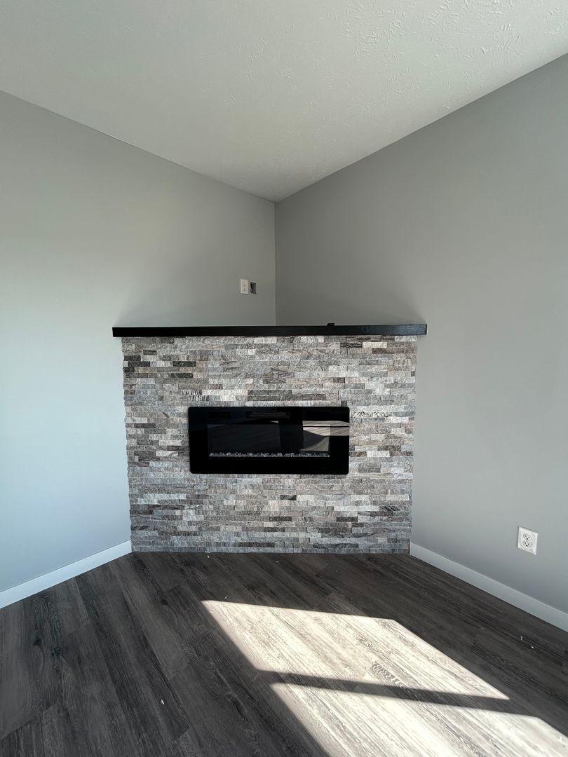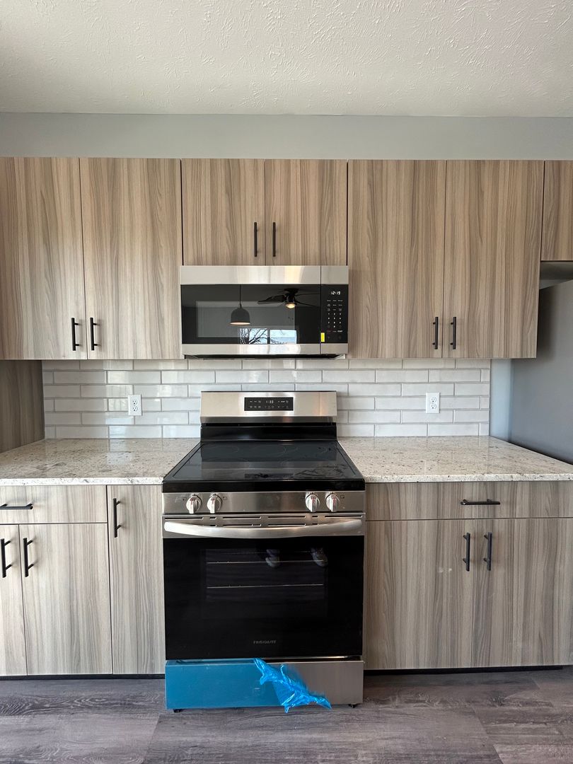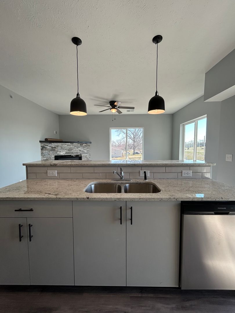 As you step inside, you’re greeted by a large open living room with beautiful luxury vinyl plank flooring, modern gray tones, and large windows that bring in plenty of natural light. A stylish electric fireplace feature wall adds a cozy and modern focal point to the space while the ceiling fan provides comfort year round. The open layout flows seamlessly into the kitchen and dining area, making the entire space feel connected and inviting.