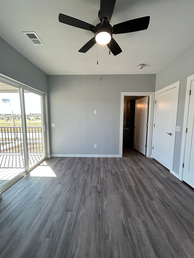Both bedrooms are generously sized and designed for comfort with large windows, ceiling fans, and modern finishes. The primary bedroom includes direct access to the balcony along with a spacious walk in closet and bathroom, providing plenty of storage space.