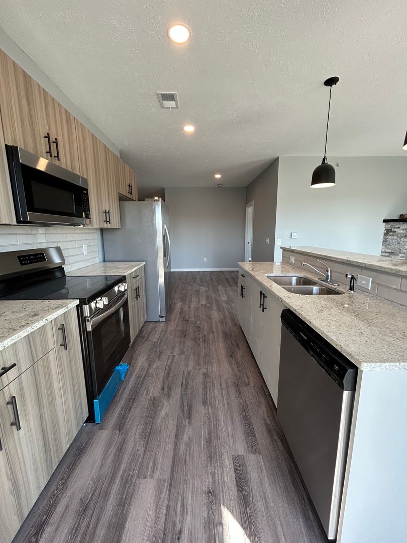 The kitchen features beautiful cabinetry, sleek granite style countertops, stainless steel appliances, and modern pendant lighting. A spacious center island with a double sink offers additional prep space and seating, making it perfect for cooking, entertaining, or enjoying casual meals.
