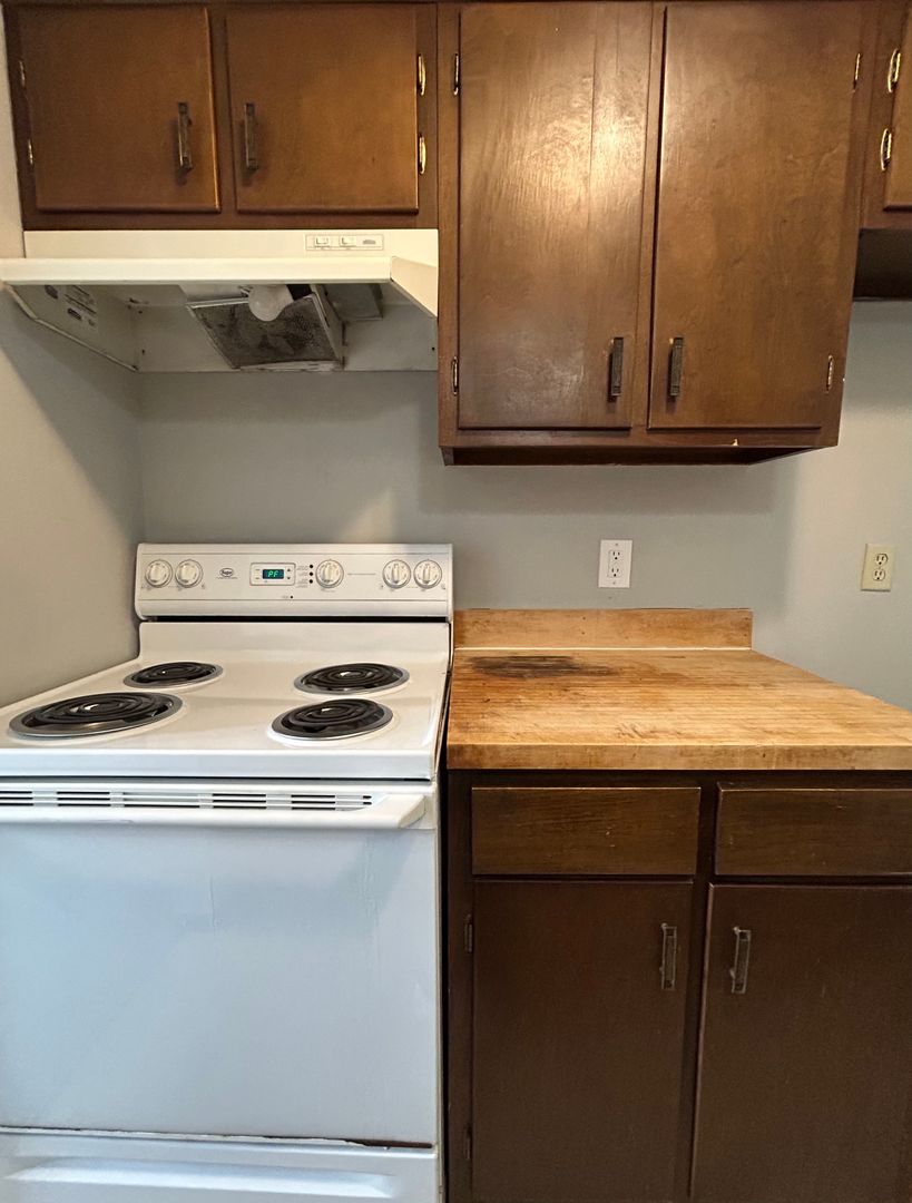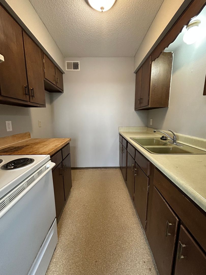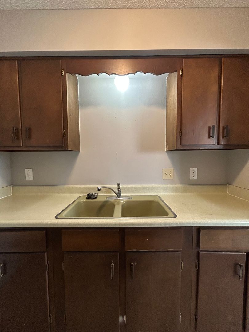 Just off the living area, the kitchen offers ample cabinet storage and counter space, making it both functional and practical for everyday living. The layout creates a natural separation between spaces while still feeling connected.